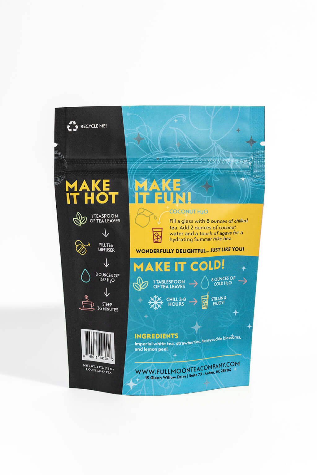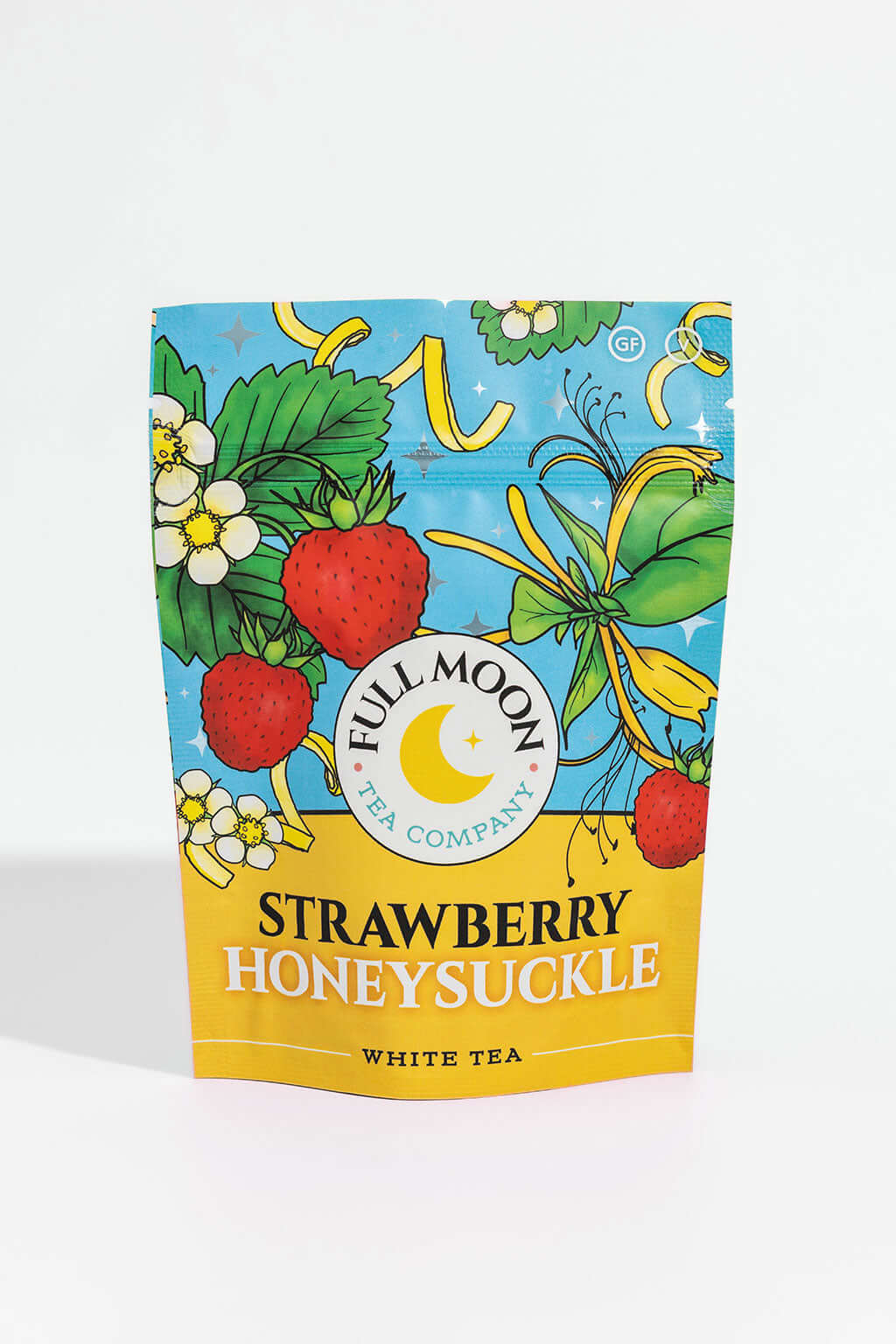 Organic white tea, strawberries, organic lemon peel, honeysuckle flowers.