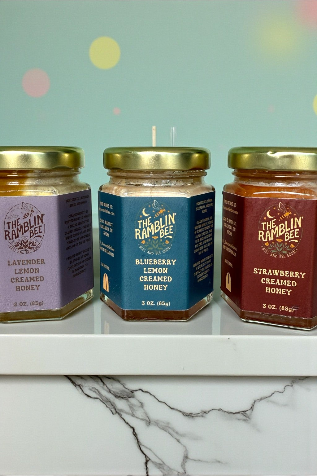 Sweet, smooth, and irresistibly spreadable, this handcrafted creamed honey trio from The Ramblinβ Bee is the perfect treat for tea lovers and foodies alike. Each set includes three 3-oz jars of luxuriously whipped Tennessee honey in dreamy flavors: Lavender Lemon, Strawberry, and Blueberry Lemon.