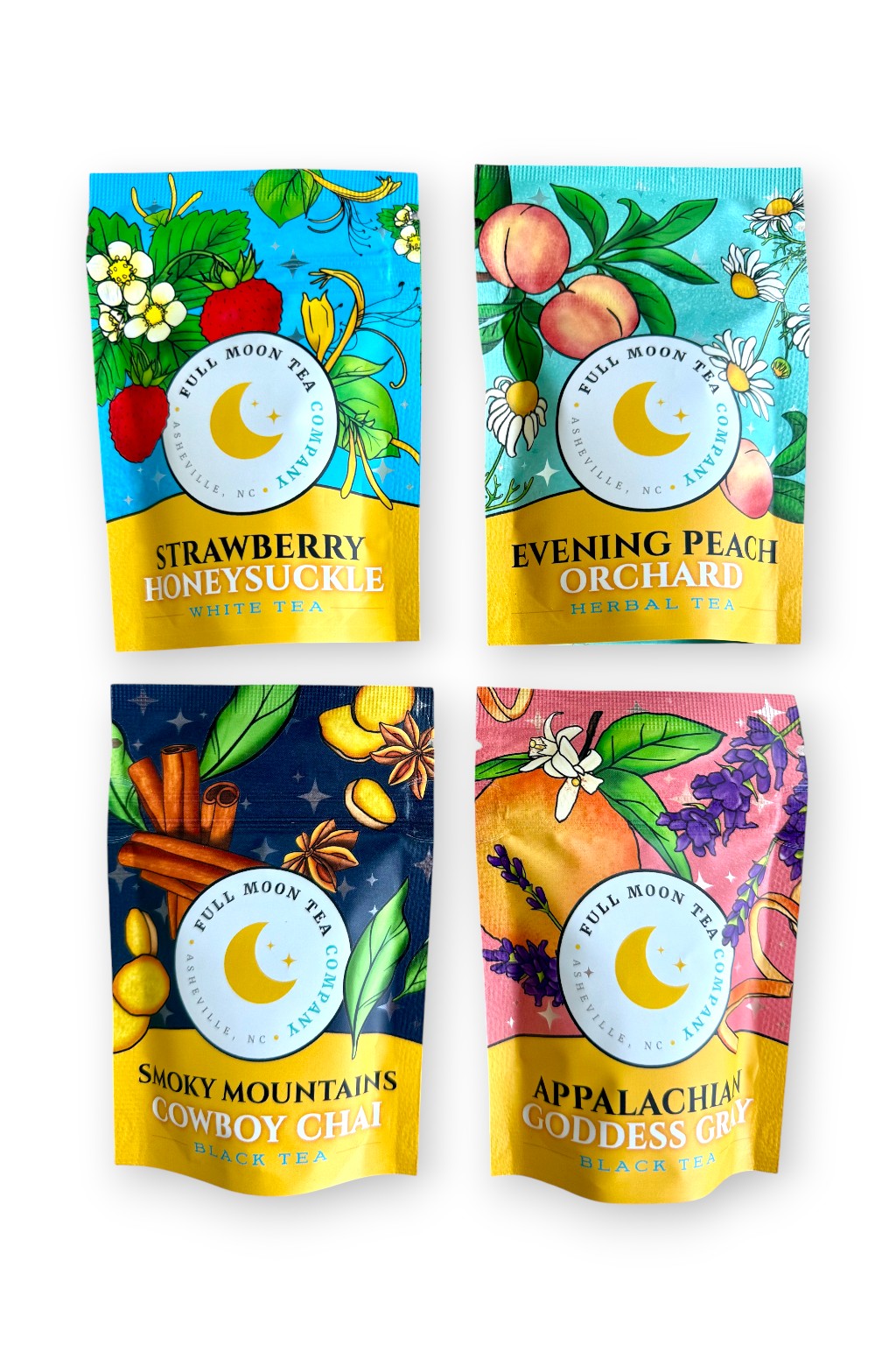 Discover why everyone loves Full Moon Tea Company with our Best Sellers Sampler Box. This bright, gift-ready set features four of our top blends in adorable sample-size pouches plus a pack of 12 compostable single-use tea bags so you can steep loose leaf anywhere. It is the easiest way to explore our most loved flavors or share them with someone new.